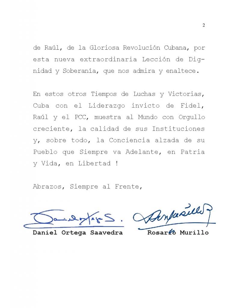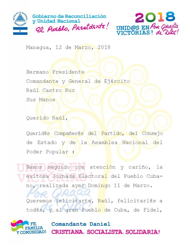 El Presidente – Comandante Daniel Ortega Saavedra y la Vicepresidenta Compañera Rosario Murillo, enviaron un mensaje al Presidente de Cuba, Comandante Raúl Castro, para saludar al pueblo cubano por la jornada electoral realizada el pasado domingo.