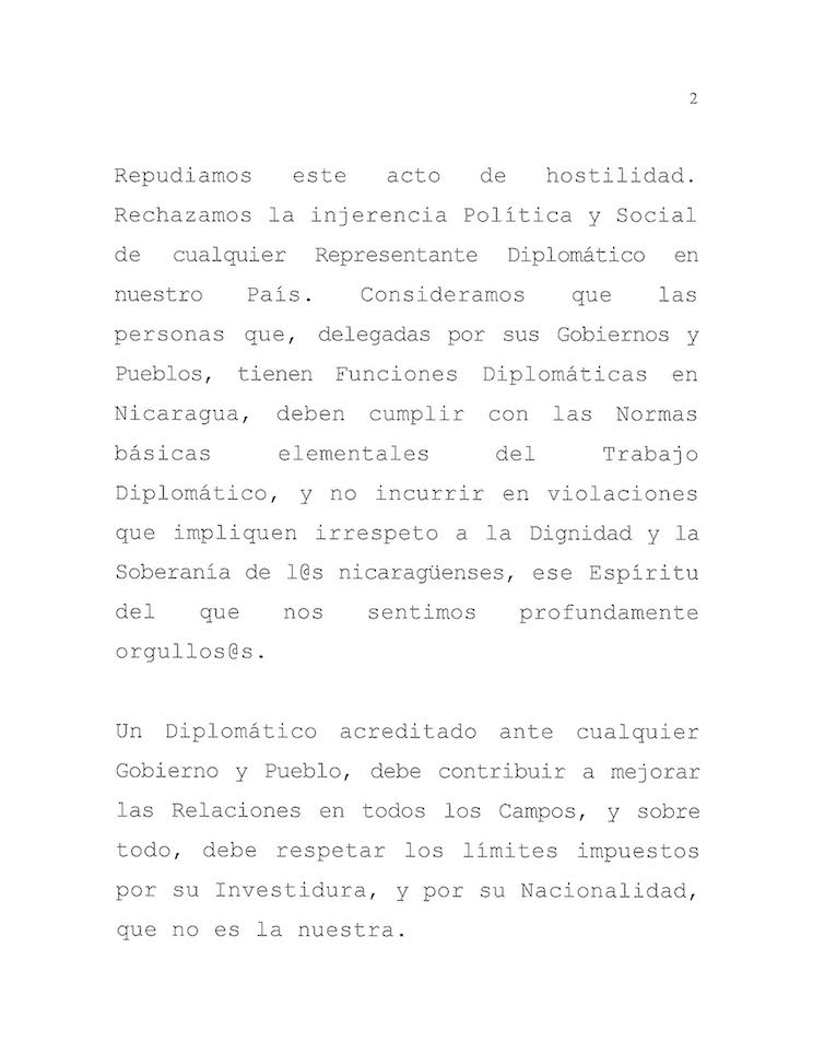 Repudiamos este acto de hostilidad. Rechazamos la injerencia Política y Social de cualquier Representante Diplomático en nuestro País. Consideramos que las personas que, delegadas por sus Gobiernos y Pueblos, tienen Funciones Diplomáticas en Nicaragua, deben cumplir con las Normas básicas elementales del Trabajo Diplomático, y no incurrir en violaciones que impliquen irrespeto a la Dignidad y la Soberanía de los nicaragüenses, ese Espíritu del que nos sentimos profundamente orgullosos.