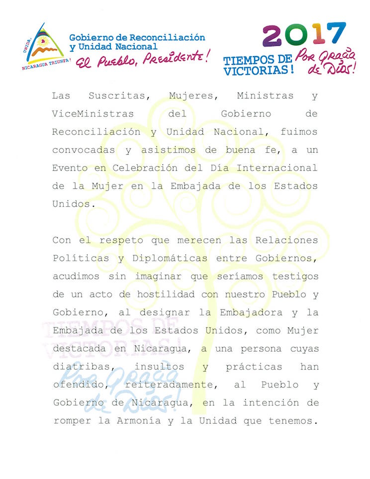 Con el respeto que merecen las Relaciones Políticas y Diplomáticas entre Gobiernos, acudimos sin imaginar que seríamos testigos de un acto de hostilidad con nuestro Pueblo y Gobierno, al designar la Embajadora y la Embajada de los Estados Unidos, como Mujer destacada en Nicaragua, a una persona cuyas diatribas, insultos y prácticas han ofendido, reiteradamente, al Pueblo y Gobierno de Nicaragua, en la intención de romper la Armonía y la Unidad que tenemos.