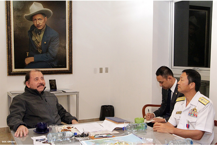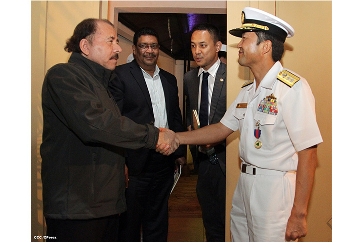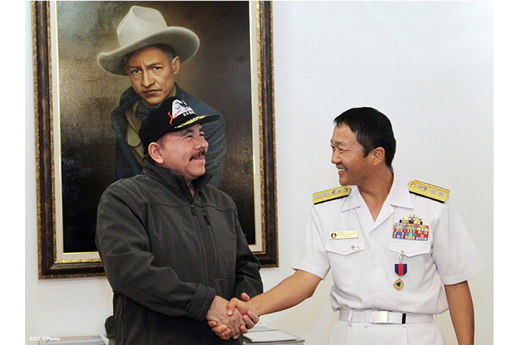 El Presidente de la República, Comandante Daniel Ortega Saavedra, sostuvo un encuentro con el contralmirante Yasuki Nakahata, comandante del Escuadrón de Entrenamiento de las Fuerzas Marítimas de Autodefensa, quienes realizaron una visita a Nicaragua en el marco del 80 aniversario de las relaciones diplomáticas y comerciales entre Nicaragua y Japón.