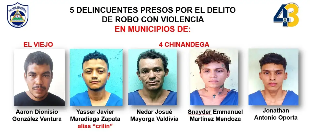 Asimismo, los sujetos Aarón Dionisio González Ventura, Yasser Javier Maradiaga Zapata, alias “Crilin”, Nedar Josué Mayorga Valdivia, Snayder Emmanuel Martínez Mendoza y Jonathan Antonio Oporta cayeron presos por realzar robos con violencia en los municipios de El Viejo y Chinandega.