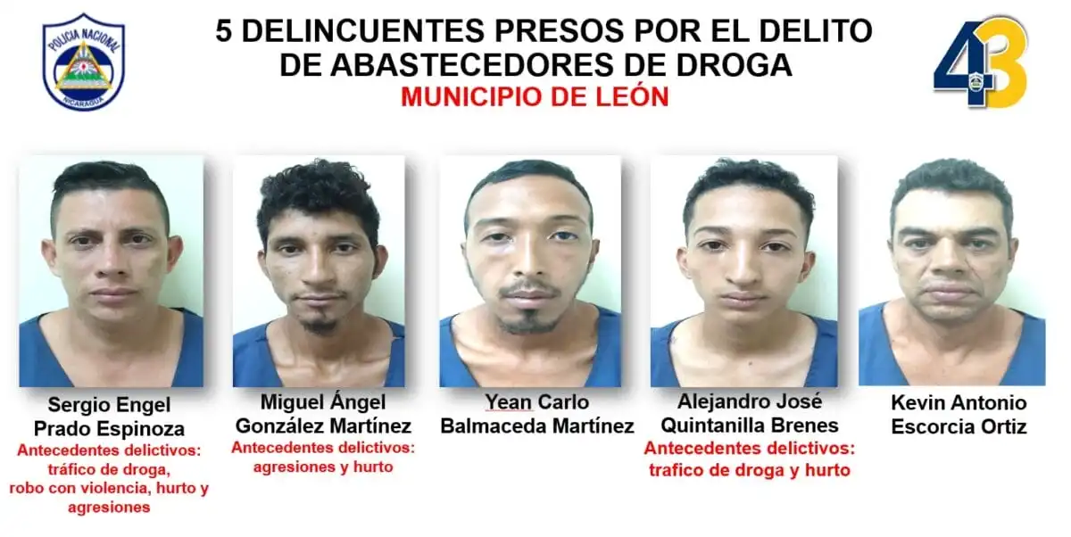 Por otro lado, Sergio Engel Prado Espinoza, Miguel Ángel González Martínez, Yean Carlos Balmaceda Martínez, Alejandro José Quintanilla Brenes y Kevin Antonio Escorcia Ortiz fueron puestos en prisión por abastecimiento de drogas en el municipio de León.