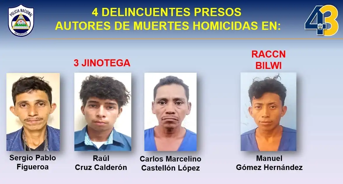 Entre los homicidas detenidos se encuentran Sergio Pablo Figueroa, Raúl Cruz Calderón y Carlos Marcelino Castellón López, de Jinotega, así como Manuel Gómez Hernández, de Bilwi, Caribe Norte.