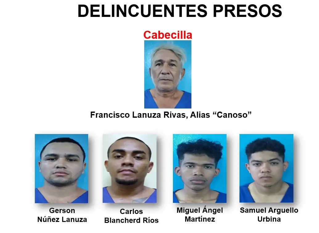 El primer grupo estaba encabezado por Francisco Lanuza Rivas, alias “El Canoso”, y la integraban además Gerson Núñez Lanuza, Carlos Blancherd Ríos, Miguel Ángel Martínez y Samuel Arguello Urbina, quienes presuntamente cometían asaltos con armas de fuego a bordo de motos en los distritos 4, 5, 6 y 7 de Managua.