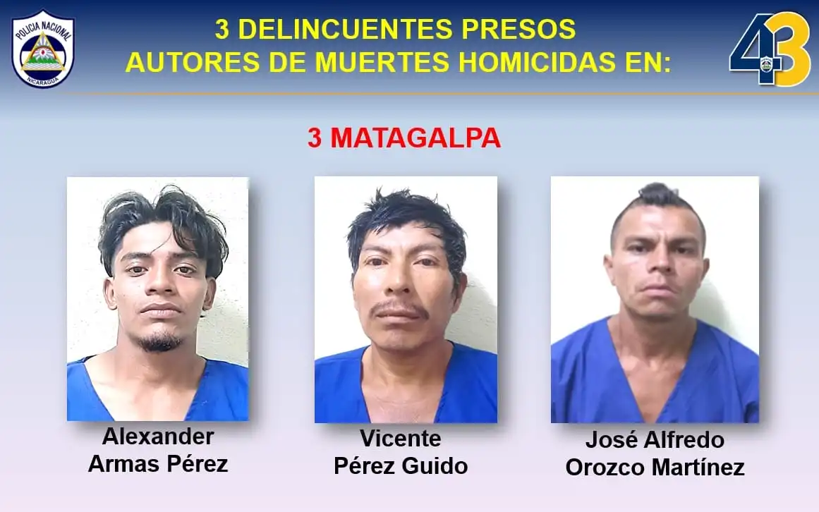 El vocero policial detalló que Alexander Armas Pérez, Vicente Pérez Guido y José Alfredo Orozco Martínez fueron detenidos por homicidios ocurridos en Matagalpa.