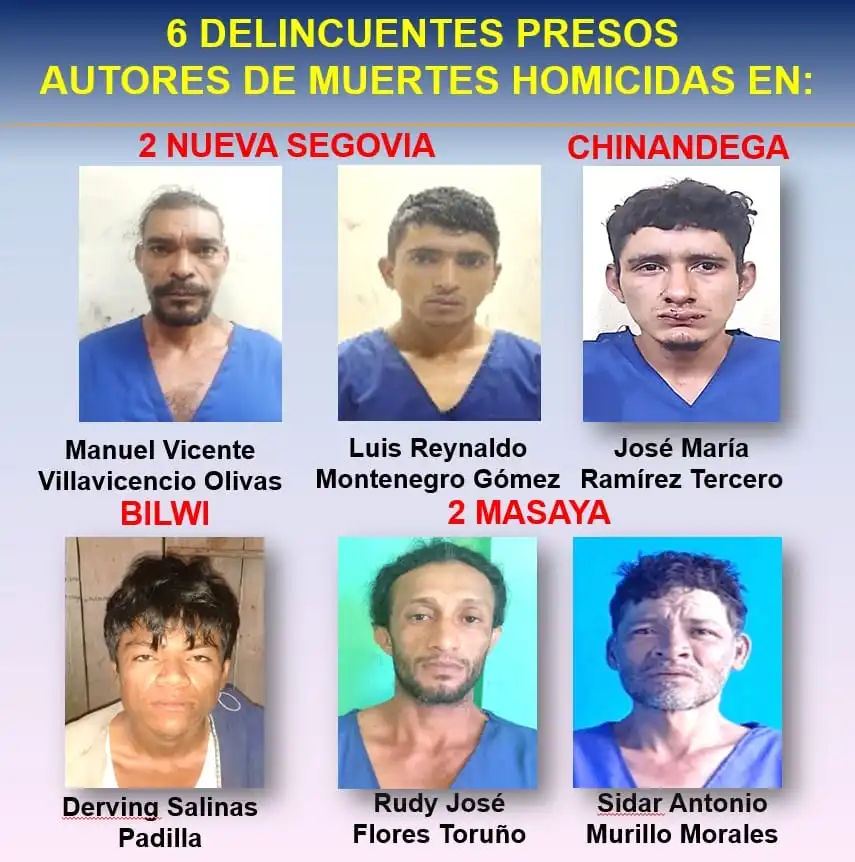 El vocero policial detalló que Manuel Vicente Villavicencio Olivas, Luis Reynaldo Montenegro Gómez, José María Ramírez Tercero, Derving Salinas Padilla, Rudy José Flores Toruño y Sidar Antonio Murillo Morales fueron detenidos por homicidios ocurridos en Nueva Segovia, Chinandega, Bilwi y Masaya, respectivamente.