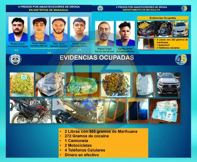 Mientras que en diferentes distritos de la ciudad de Managua, fueron capturados por el delito de abastecimiento de drogas: Wuesly Daniel Orochena Rodríguez, Yerson Ramón González Méndez, Eddy Javier Hansack Rosales y Moisés Isaías González Rivera.