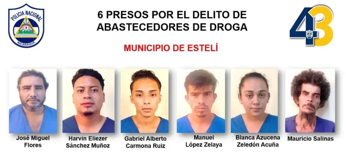 El comisionado mayor Alejandro Ruiz Martínez, jefe de la Policía en Estelí, informó que José Miguel Flores, Harvin Eliezer Sánchez Muñoz, Gabriel Alberto Carmona Ruiz, Manuel López Zelaya, Blanca Azucena Zeledón Acuña y Mauricio Salinas fueron arrestados por abastecimiento de drogas en el municipio de Estelí.