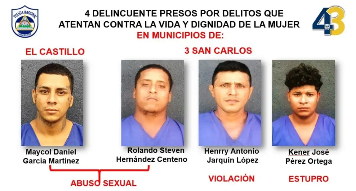 Finalmente, Maycol Daniel García Martínez y Rolando Steven Hernández Centeno fueron detenidos por abuso sexual; Henry Antonio Jarquín López por violación y Kener José Pérez Ortega por estupro, delitos cometidos en los municipios de El Castillo y San Carlos.