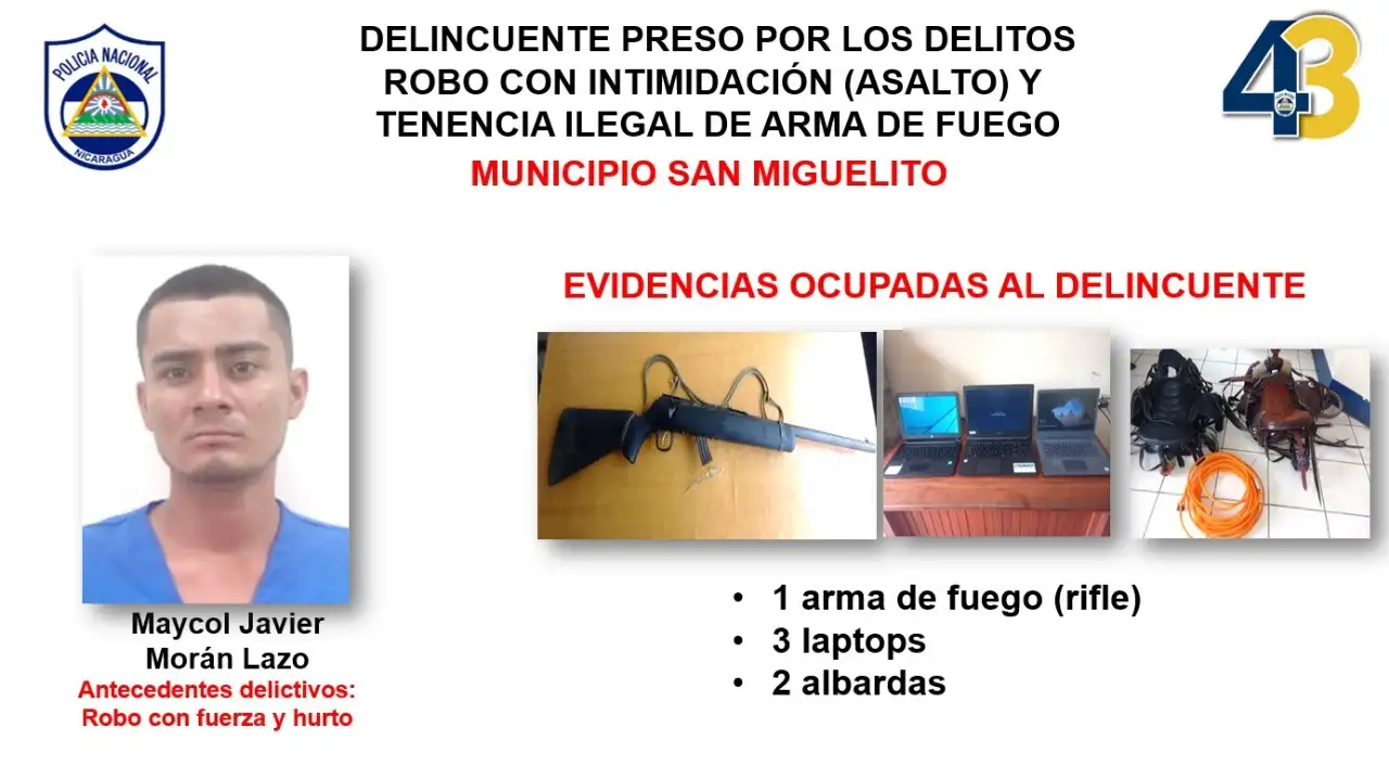 Por otra parte, Luis Enrique Blandón Sánchez fue apresado por robo con violencia en el municipio de San Carlos.