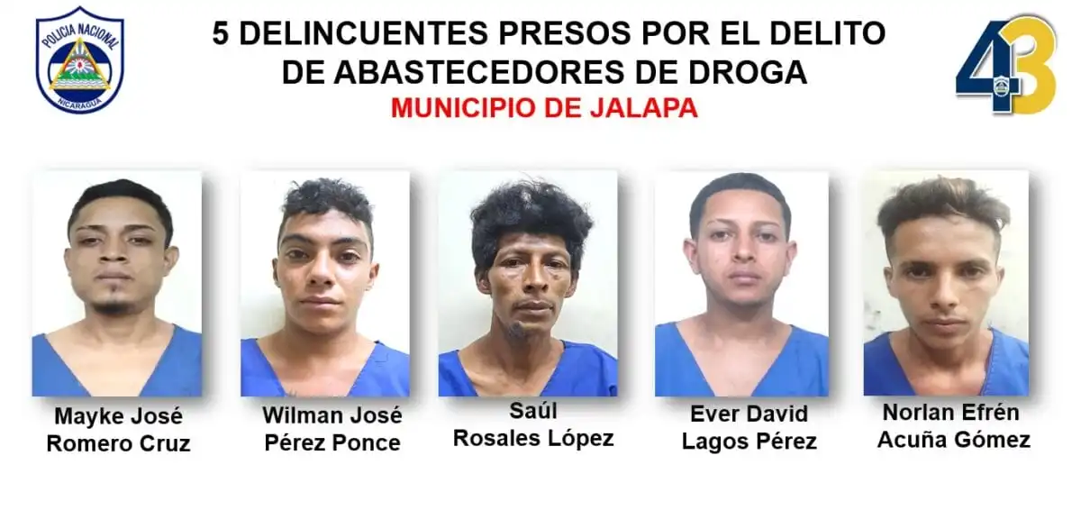 Los sujetos Mayke José Romero Cruz, Wilman José Pérez Ponce, Saúl Rosales López, Ever David Lagos Pérez y Norlan Efrén Acuña Gómez fueron sacados de circulación por dedicarse a la venta de drogas en el municipio de Jalapa.
