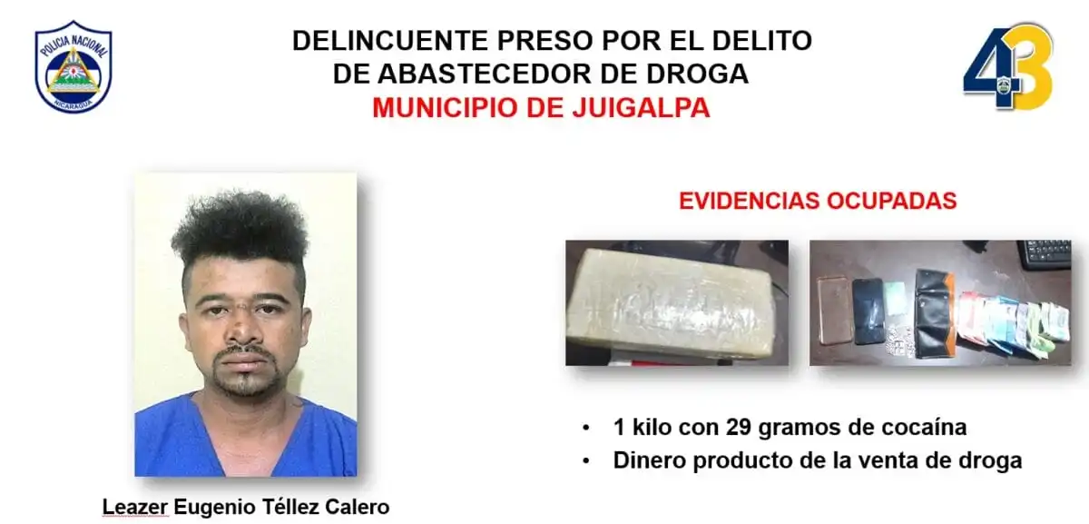 El sujeto Leazer Eugenio Téllez Calero fue detenido por agentes de la Policía Nacional en el municipio de Juigalpa, en el departamento de Chontales, después de que le incautaron un kilo con 29 gramos de cocaína y dinero producto de la venta de drogas.