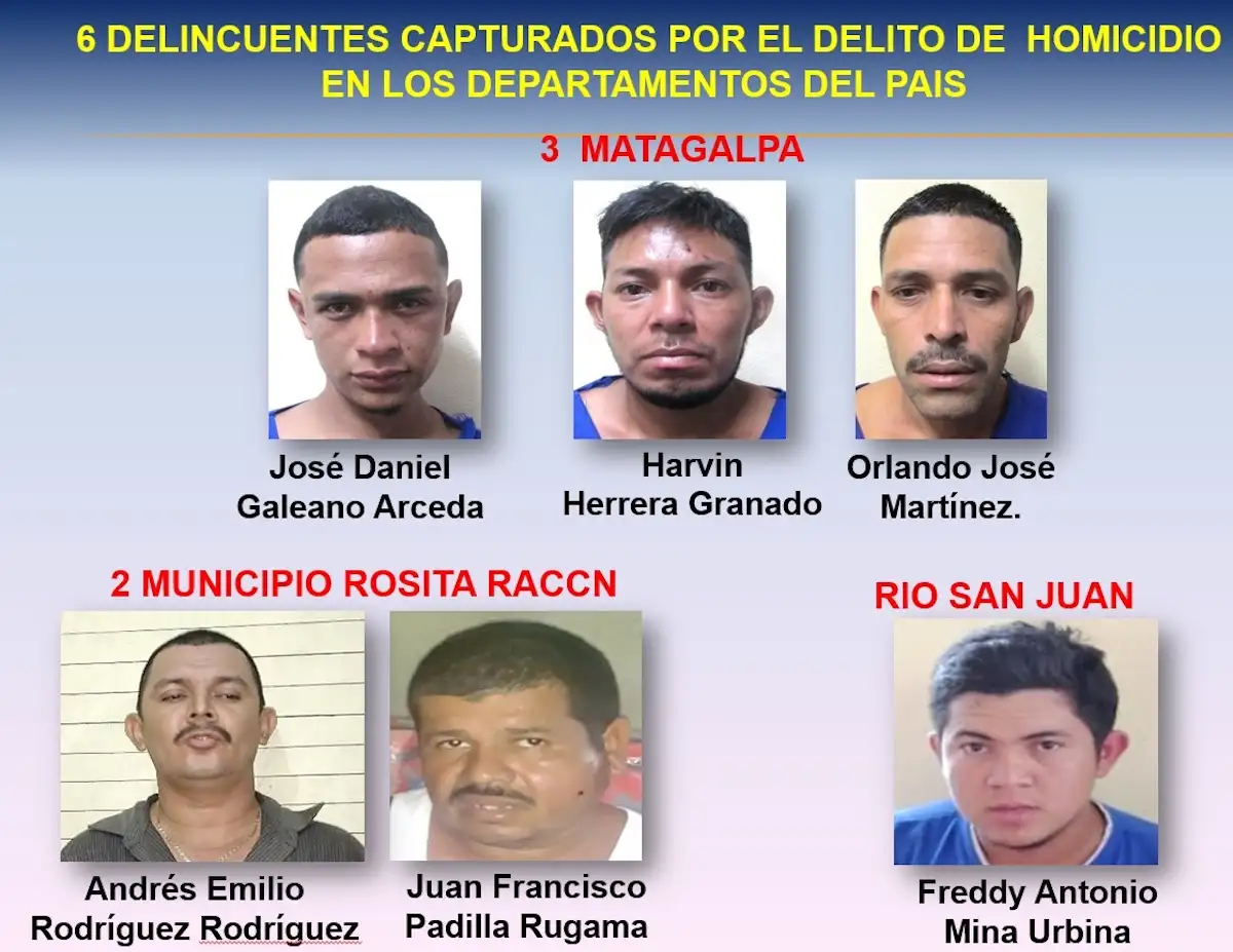 Por el delito de asesinato, en Bonanza fue detenido Román Martínez Martínez, en tanto en José Daniel Galeano Arceda, Harvin Herrera Granados, Orlando José Martínez, Freddy Antonio Mina Urbina, Andrés Emilio Rodríguez y Juan Francisco Padilla Rugama, fueron arrestados por diferentes homicidios.