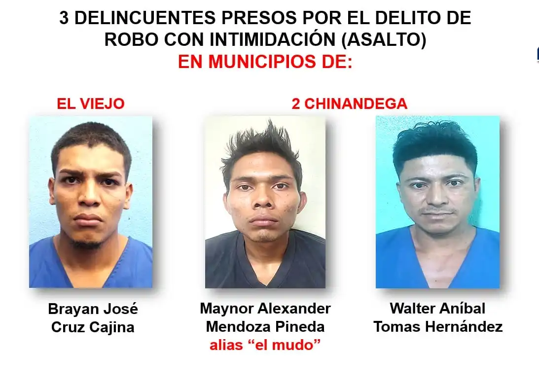 La jefatura policial departamental detalló que los sujetos Brayan José Cruz Cajina, Maynor Alexander Mendoza Pineda, alias “El Mudo”, y Walter Aníbal Tomas Hernández fueron capturados por cometer asaltos en los municipios de El Viejo y Chinandega.