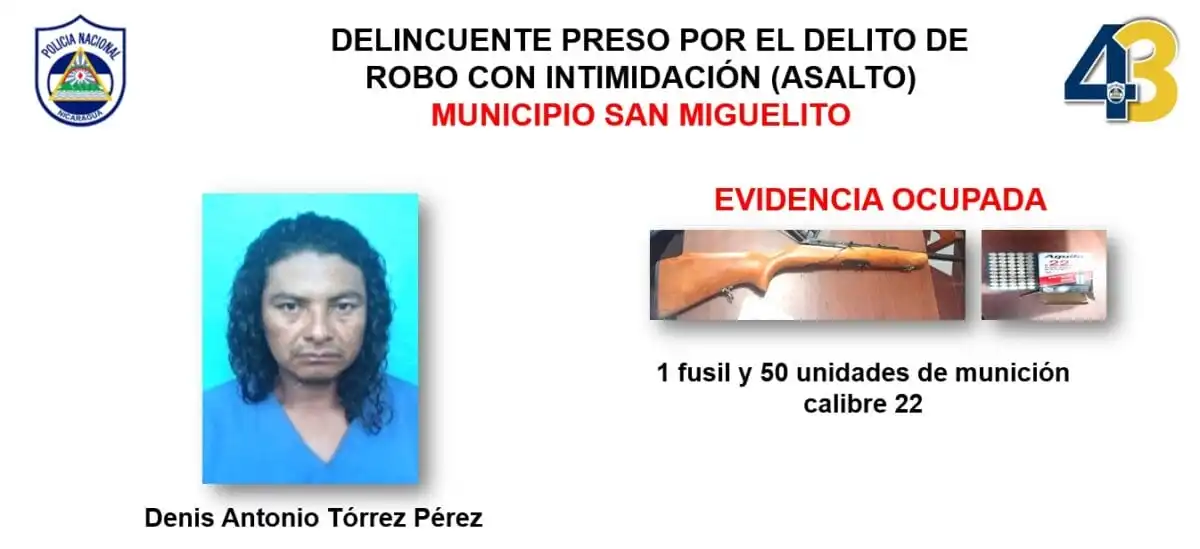 La jefatura policial departamental informó que Denis Antonio Tórrez Pérez fue detenido por haber asaltado a una persona en la comarca Never Oporta, de San Miguelito, tras lo cual le fue ocupado un fusil calibre 22 con 50 municiones.