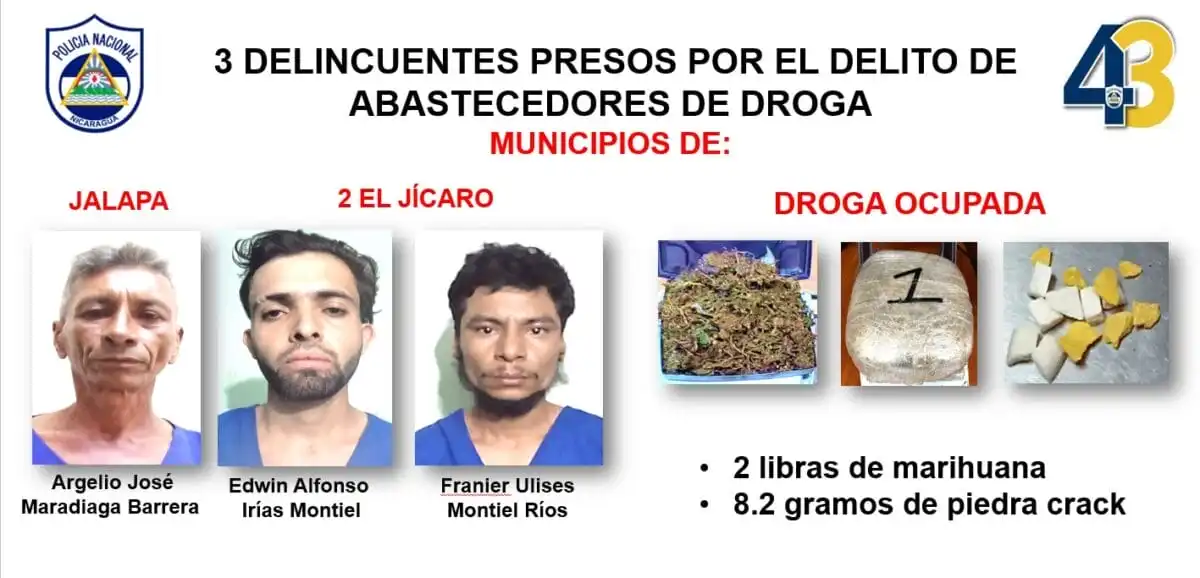 Por otra parte, la Policía detuvo a Argelio José Maradiaga Barrera, Edwin Alfonso Irías Montiel y Franier Ulises Montiel Ríos por dedicarse al abastecimiento de drogas en Jalapa y El Jícaro, donde les incautaron dos libras de marihuana y 8.2 gramos de piedras crack.