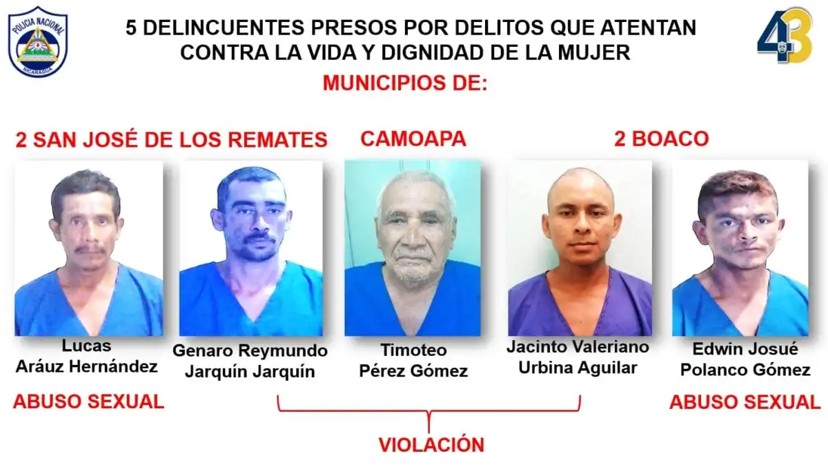 De igual manera, los sujetos Lucas Aráuz Hernández y Edwin Josué Polanco Gómez fueron arrestados por haber cometido abusos sexuales en los municipios de San José de los Remates y Boaco.