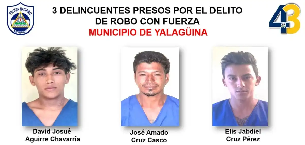 Asimismo, David Josué Aguirre Chavarría, José Amado Cruz Casco y Elis Jabdiel Cruz Pérez fueron arrestados por cometer robos con fuerza en perjuicio de dos personas en las comunidades San Ramón y La Esperanza, en Yalagüina.
