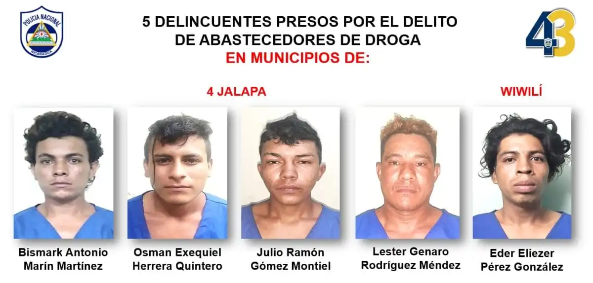 La jefatura policial en la zona informó que los sujetos Bismark Antonio Marín Martínez, Osman Exequiel Herrera Quintero, Julio Ramón Gómez Montiel, Léster Genaro Rodríguez Méndez y Eder Eliezer Pérez González fueron detenidos por abastecimiento de drogas en los municipios de Jalapa y Wiwilí.