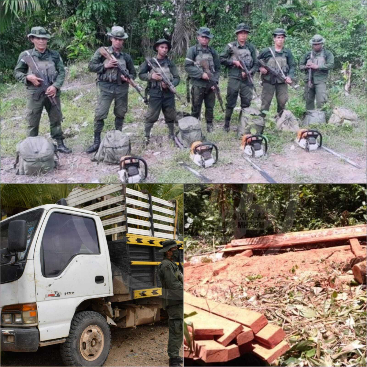 Según una nota informativa de la institución castrense, a los cuatro sujetos se les ocupó 91 pilotes, equivalentes a 400 pies tablar, cuatro motosierras y un camión marca Isuzu multicolor, placa LE 23848, después de que no presentaron la documentación establecida.