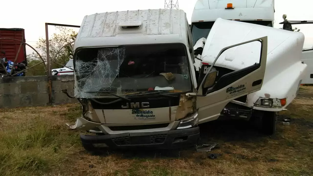 Los vehículos involucrados son el camión marca JMC color blanco, sin placa, y el cabezal Volvo color blanco matrícula M 100-633, que jalaba una cisterna con 32 toneladas de aceite de palma africana.