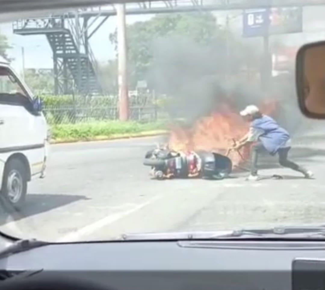 Sin su medio de trabajo se quedó al mediodía de este sábado un joven que prestaba servicios de delivery, luego de que su motocicleta tomó fuego repentinamente en la rotonda La Virgen, en Managua.
