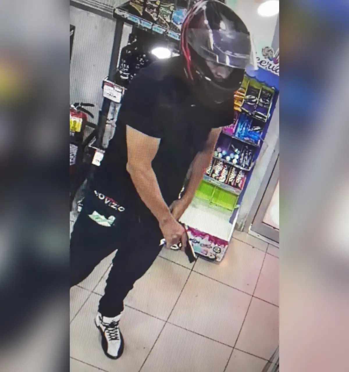 A pesar de que no se quitó el casco de seguridad al ingresar, la cara del sujeto quedó captada y la ropa y los zapatos que vestía son muy singulares, de tal manera que esas pistas podrían servir a la Policía para su identificación y pronta captura.