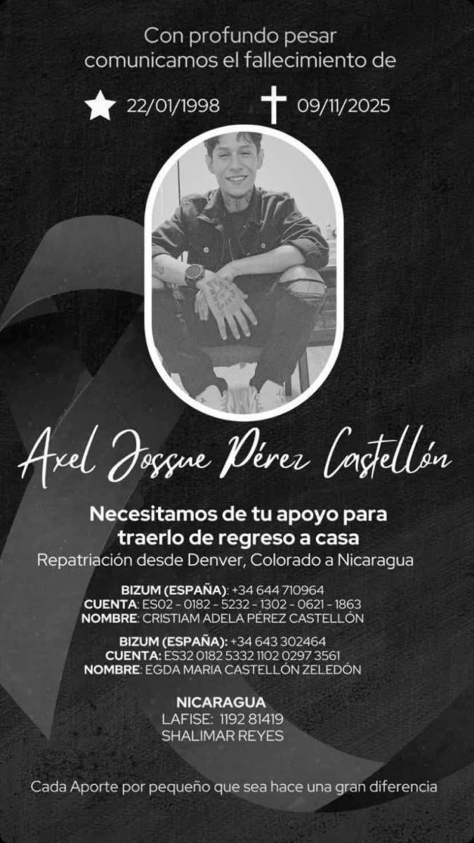 Cristian explicó que Axel no tenía familia en Estados Unidos y que todos sus parientes están en España, pero la ayuda será enviada a su madre Egda María Castellón Zeledón, quien tiene que viajar a Denver a reclamar los restos mortales.
