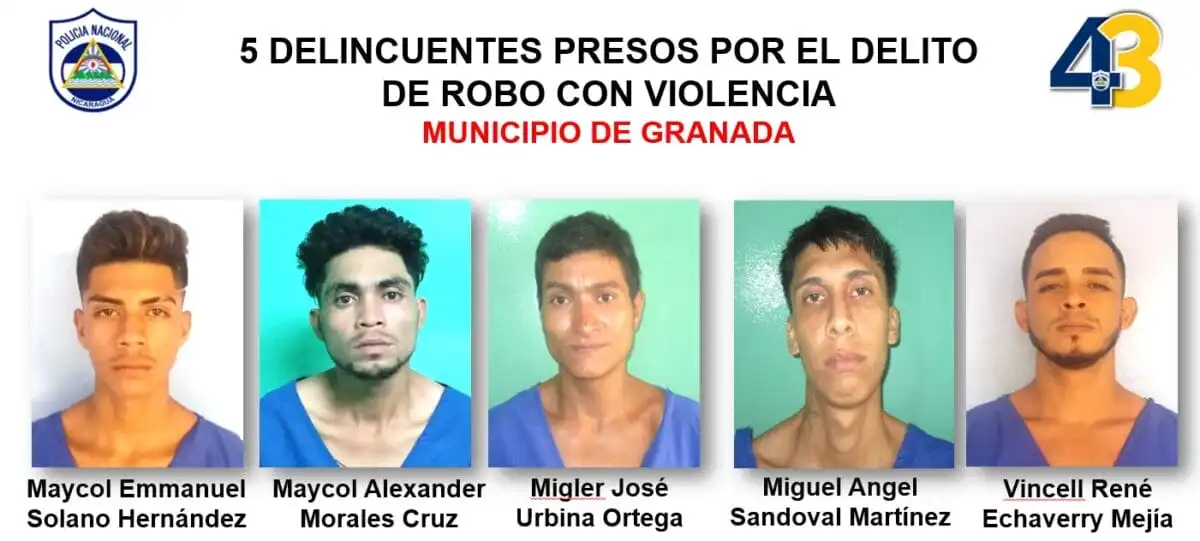 El jefe policial departamental detalló que los sujetos Maycol Emmanuel Solano Hernández, Maycol Alexander Morales Cruz, Migler José Urbina Ortega, Miguel Ángel Sandoval Martínez y Vincell René Echaverry Mejía fueron detenidos por cometer robos con violencia en el municipio de Granada.
