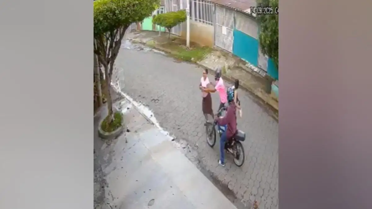 En ese instante, uno de los maleantes, vestido con camiseta color rosado, pantalón gris y zapatos deportivos blancos, salta de la moto para cometer la fechoría contra su víctima, a quien aparentemente iban vigilando.