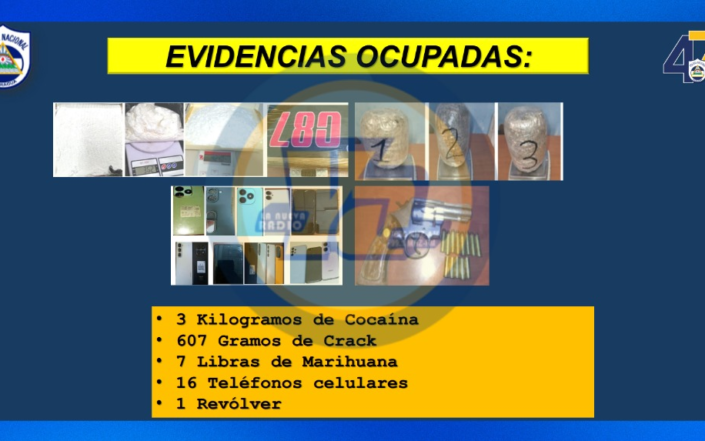 A los capturados se les ocupó 3 kilogramos de cocaína, 607 gramos de crack, 7 libras de marihuana, 16 celulares y un revólver.