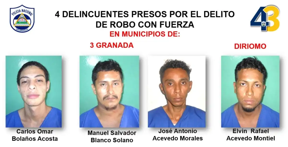 En el mismo orden, los sujetos Carlos Omar Bolaños Acosta, Manuel Salvador Blanco Solano, José Antonio Acevedo Morales y Elvin Rafael Acevedo Montiel fueron detenidos por haber cometido robos con fuerza en los municipios de Granada y Diriomo.