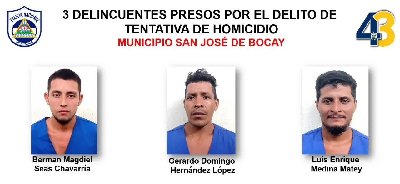 Berman Magdiel Zeas Chavarría, Gerardo Domingo Hernández López y Luis Enrique Medina Matey fueron detenidos por tentativa de homicidio en San José de Bocay.
