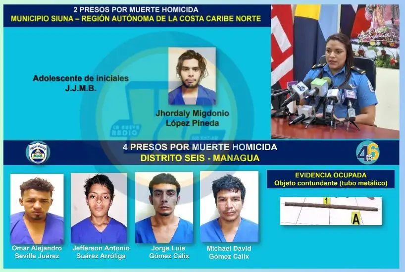 En el Distrito Seis, en Managua, también fueron detenidos Omar Alejandro Sevilla Juárez, Jefferson Antonio Suárez Arróliga, Jorge Luis Gómez Cálix y Michael David Gómez Cálix, por el homicidio en perjuicio del caponero Elderson Otoniel Aguirre Jarquín.
