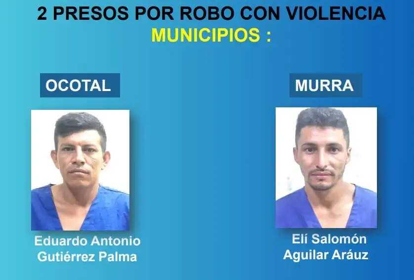 La jefatura policial departamental informó que Eduardo Antonio Gutiérrez Palma y Elí Salomón Aguilar Aráuz fueron detenidos por cometer robos con violencia en los municipios de Ocotal y Murra.