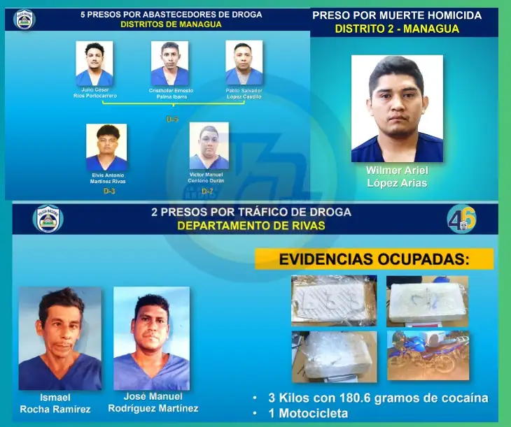 La ciudad de Managua por abastecimiento de drogas: Julio César Ríos Portocarrero, Cristhofer Ernesto Palma Ibarra, Pablo Salvador López Castillo, Elvis Antonio Martínez Rivas, y Víctor Manuel Centeno Durán.