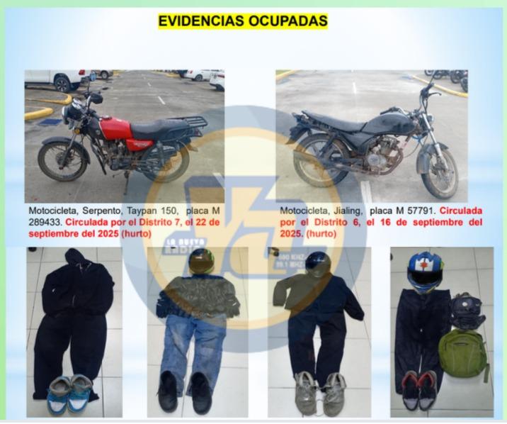 Las evidencias ocupadas una motocicleta, Serpento, Taypan 150, placa M289 433, circulada por el Distrito 7, el 22 de septiembre del 2025 por hurto. Y la motocicleta, Jialing, placa M57 791, circulada por el Distrito VI, el 16 de septiembre del 2025 por hurto.