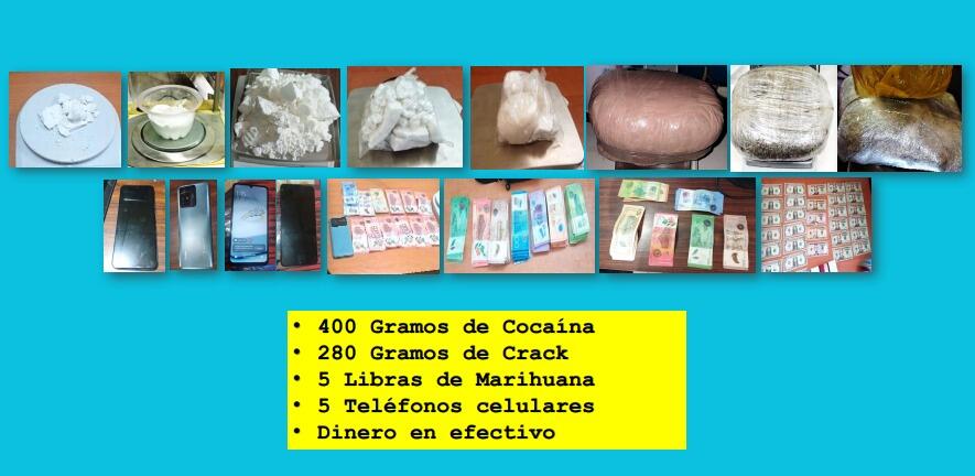 Durante los operativos, las autoridades decomisaron como evidencias 900 gramos de cocaína (500 en Managua y 400 en los departamentos), 280 gramos de crack y 5 libras de marihuana.