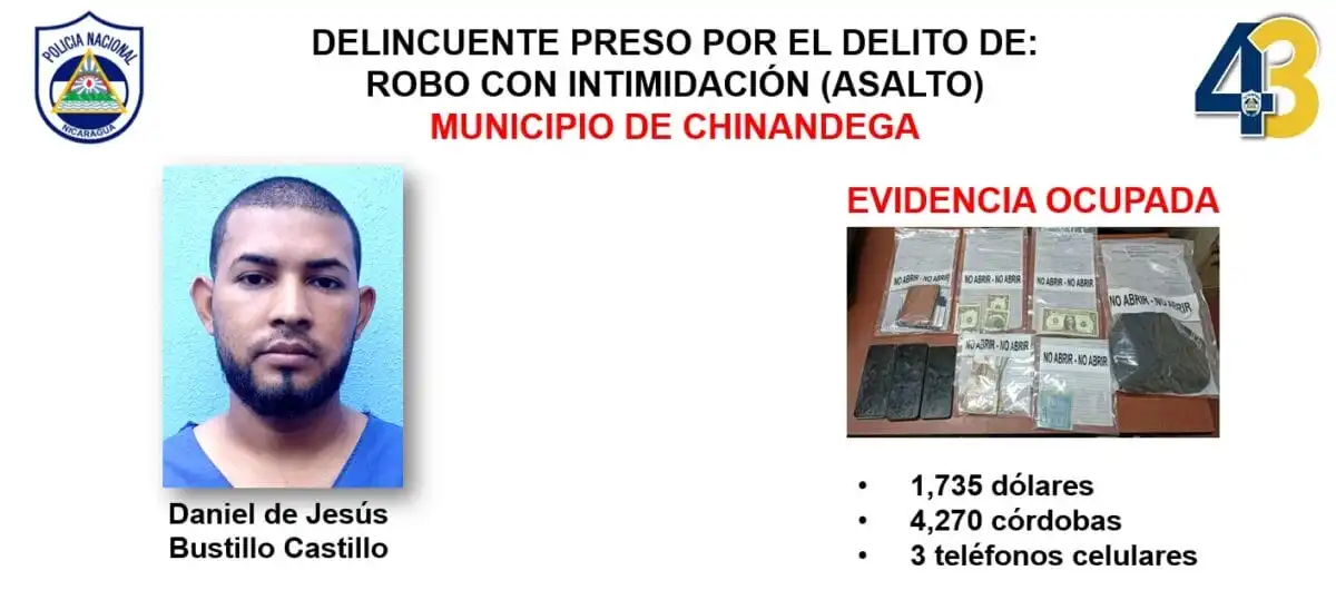 Al momento de la captura, las autoridades policiales le ocuparon como evidencias a Bustillo Castillo, 1,735 dólares, 4,270 córdobas y 3 teléfonos celulares que fueron robados durante el violento atraco.