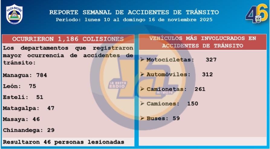 Los departamentos que registraron mayor ocurrencia de accidentes de tránsito: Managua con 784, León 75, Estelí 51, Matagalpa 47, Masaya 46, y Chinandega con 29 colisiones.
