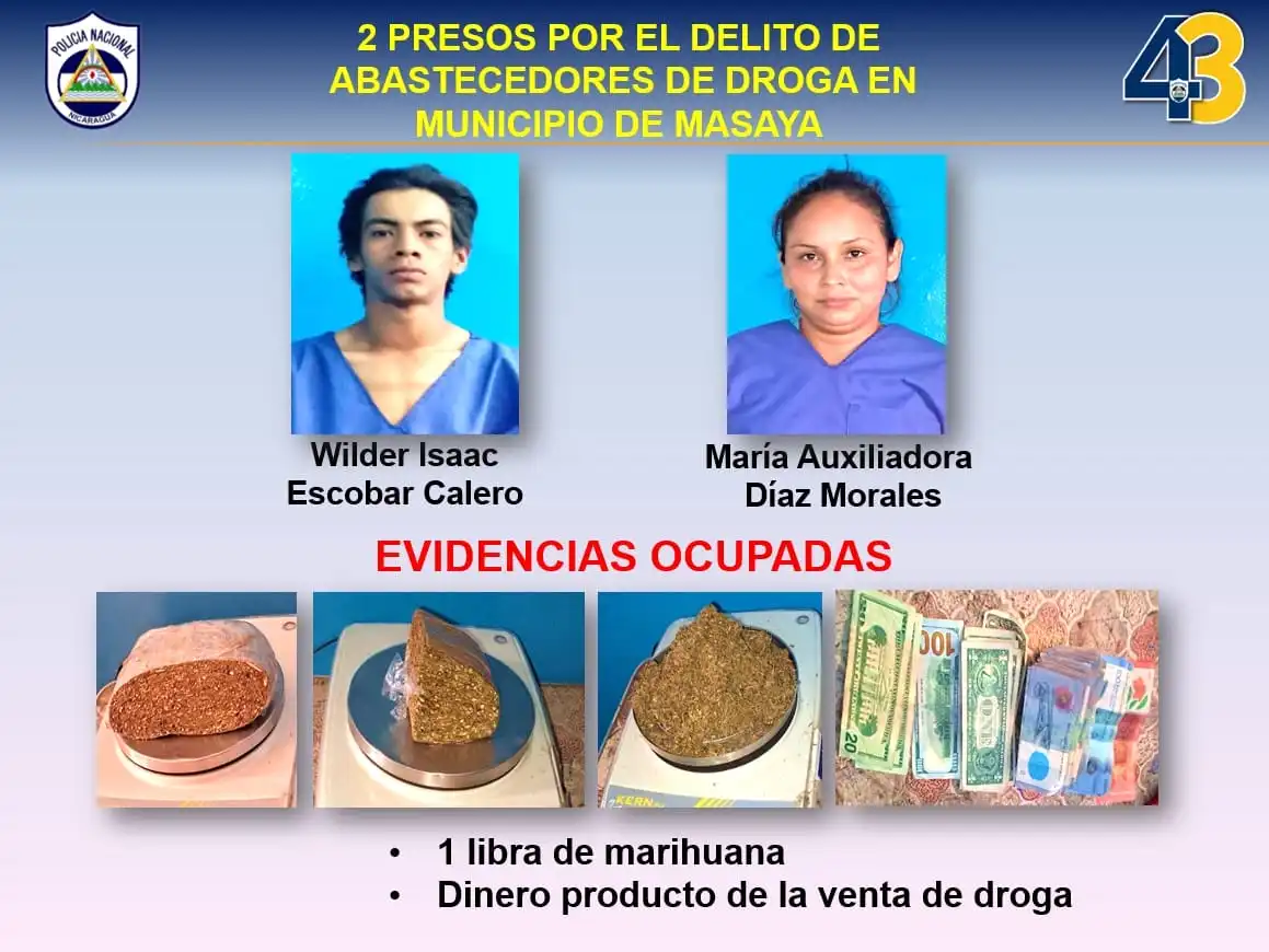 En el departamento de Masaya, la Policía también metió presos a Wilder Isaac Escobar Calero y María Auxiliadora Díaz Morales, a quienes les ocuparon una libra de marihuana y dinero producto de la venta de drogas.
