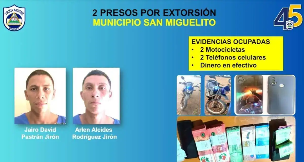 Los sujetos Jairo David Pastrán Jirón y Arlen Alcides Rodríguez Jirón fueron capturados por la Policía Nacional luego de que cometieron un delito de extorsión en el municipio de San Miguelito, del departamento de Río San Juan.