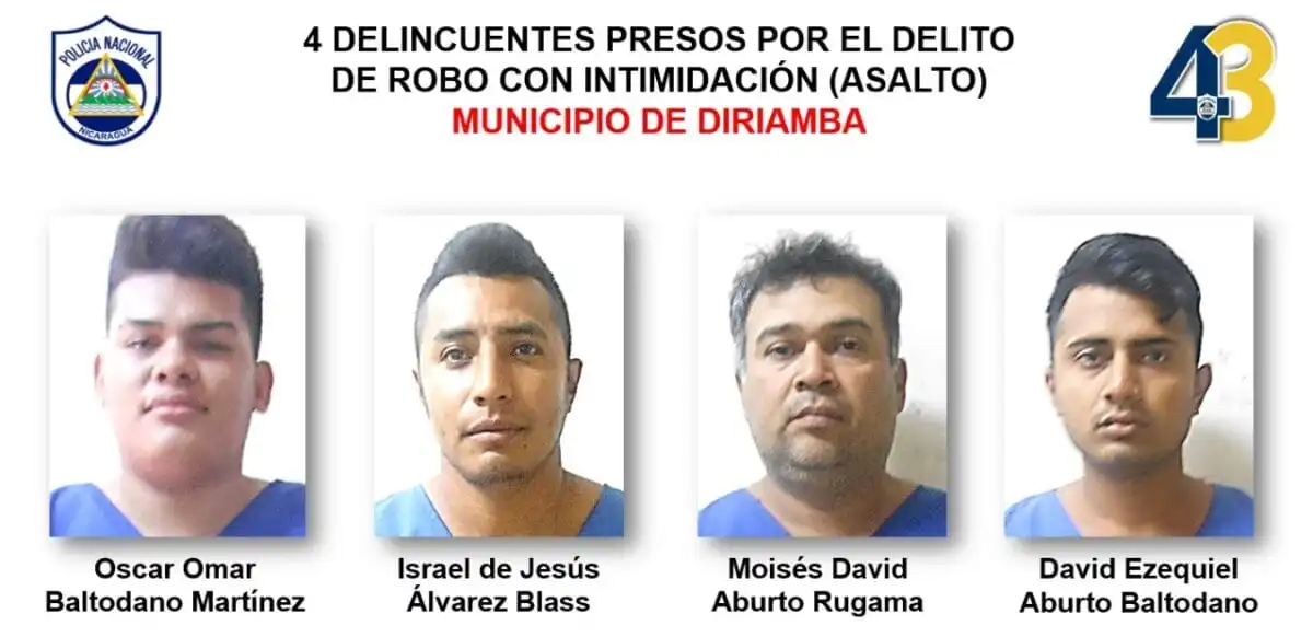El comisionado general Yuri Valle Olivares, jefe de la Policía Nacional en el departamento de Carazo, informó que Oscar Omar Baltodano Martínez, Israel de Jesús Álvarez Blass, Moisés David Aburto Rugama y David Ezequiel Aburto Baltodano fueron arrestados por realizar robos con intimidación en Diriamba.