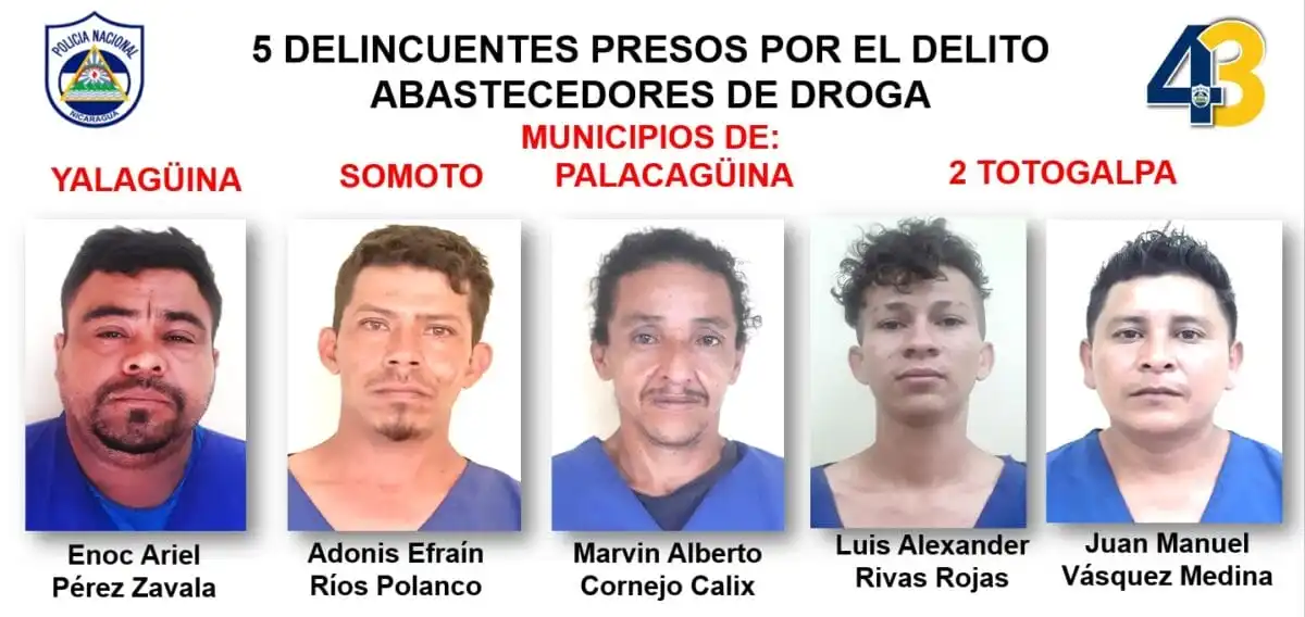 En otro orden, los sujetos Enoc Ariel Pérez Zavala, Adonis Efraín Ríos Polanco, Marvin Alberto Cornejo Cálix, Luis Alexander Rivas Rojas y Juan Manuel Vásquez Medina están tras los barrotes por dedicarse al abastecimiento de drogas en los municipios de Yalagüina, Somoto, Palacagüina y Totogalpa, respectivamente.