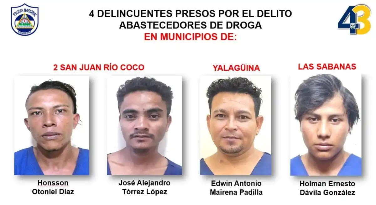 La jefatura de la Policía en ese departamento informó que Honsson Otoniel Díaz, José Alejandro Tórrez López, Edwin Antonio Mairena Padilla y Holman Ernesto Dávila González fueron arrestados por abastecimiento de drogas en San Juan de Río Coco, Yalagüina y Las Sabanas.