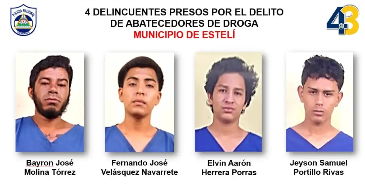 La jefatura policial informó que Bayron José Molina Tórrez, Fernando José Velásquez Navarrete, Elvin Aarón Herrera Porras, Jeyson Samuel Portillo Rivas, Laura Suyapa Molina Tórrez, Alba Yaniri Valdivia Ocampo y José Antonio González Sevilla fueron capturados por abastecimiento de drogas en el municipio de Estelí.