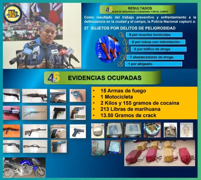 El Plan Nacional de Seguridad Ciudadana que desarrolla permanentemente la Policía, en el período del 13 al 19 de febrero 2025, ha permitido la captura de 27 sujetos involucrados en diferentes delitos.