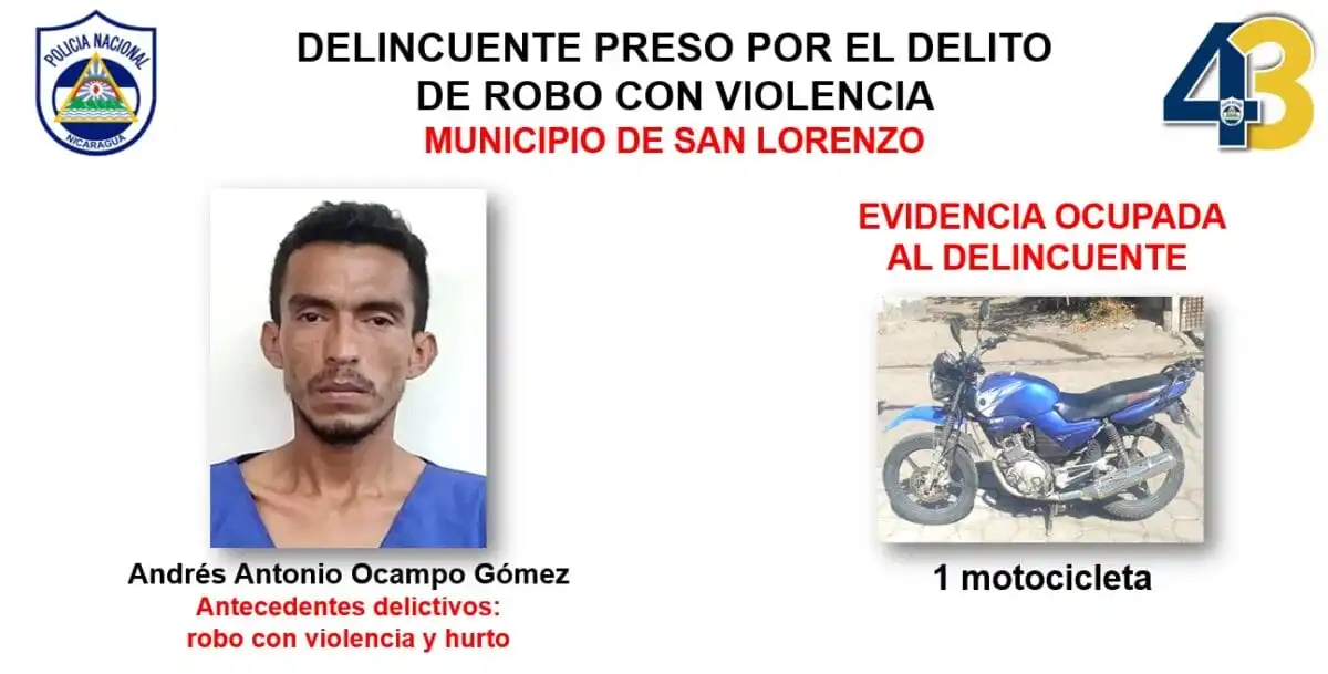 La jefatura de la Policía en Boaco informó que Andrés Antonio Ocampo Gómez fue detenido por robo con violencia cometido en San Lorenzo, Boaco, en perjuicio una persona de iniciales C.D.G., a quien despojó de una motocicleta.