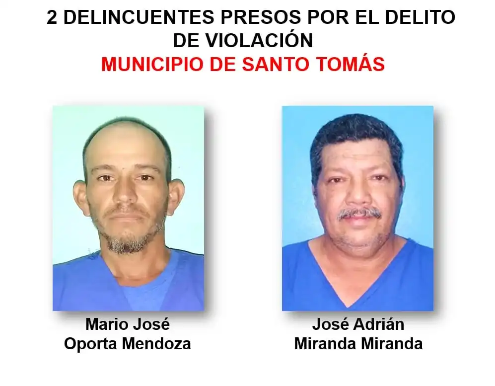 La jefatura de la Policía en ese departamento informó este jueves que Mario José Oporta Mendoza y José Adrián Miranda Miranda fueron detenidos por cometer delitos de violación en el municipio de Santo Tomás.