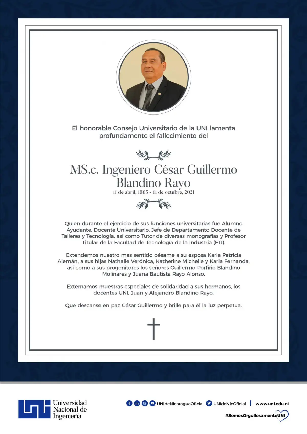 El honorable Consejo Universitario de la UNI lamentó profundamente el fallecimiento del Máster en Ciencias Ingeniero César Guillermo Blandino Rayo un profesional integral, orgulloso de ser UNI y de su adorada Facultad de Tecnología de la Industria.
